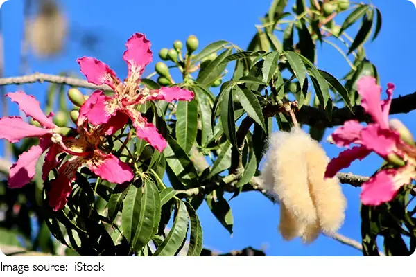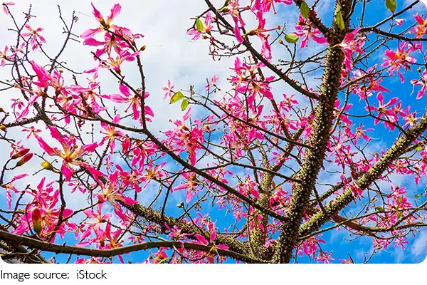 Шёлковое дерево буквально взрывается цветами — иногда ещё до того, как распустятся новые листья, а иногда одновременно с ними. Огромные бутоны окрашены в разные оттенки: от насыщенно-розового до мягкого сиреневого, с кремовыми и коричневыми штрихами ближе к центру. Каждый цветок — настоящий шедевр: длиной 7–19 см и раскрывается до 10–15 см в ширину.