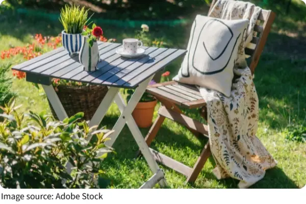 Разместите небольшую зону с креслами и столиком возле выхода из дома для утреннего кофе, а обеденную зону — ближе к зелёной части сада.